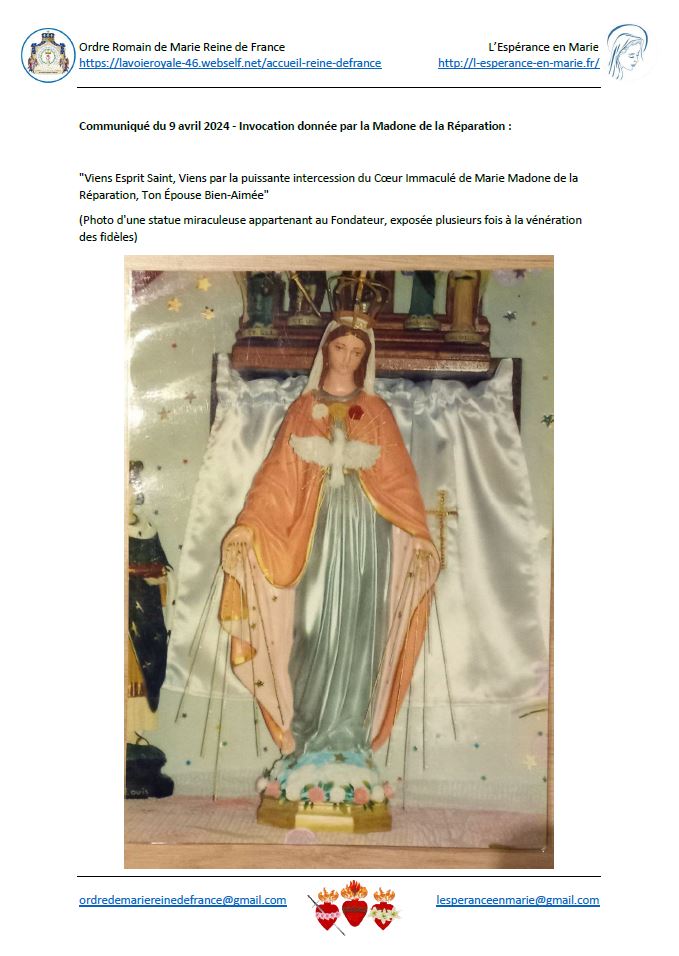 Communiqué du 9 avril 2024 – Invocation donnée par la Madone de la Réparation :
